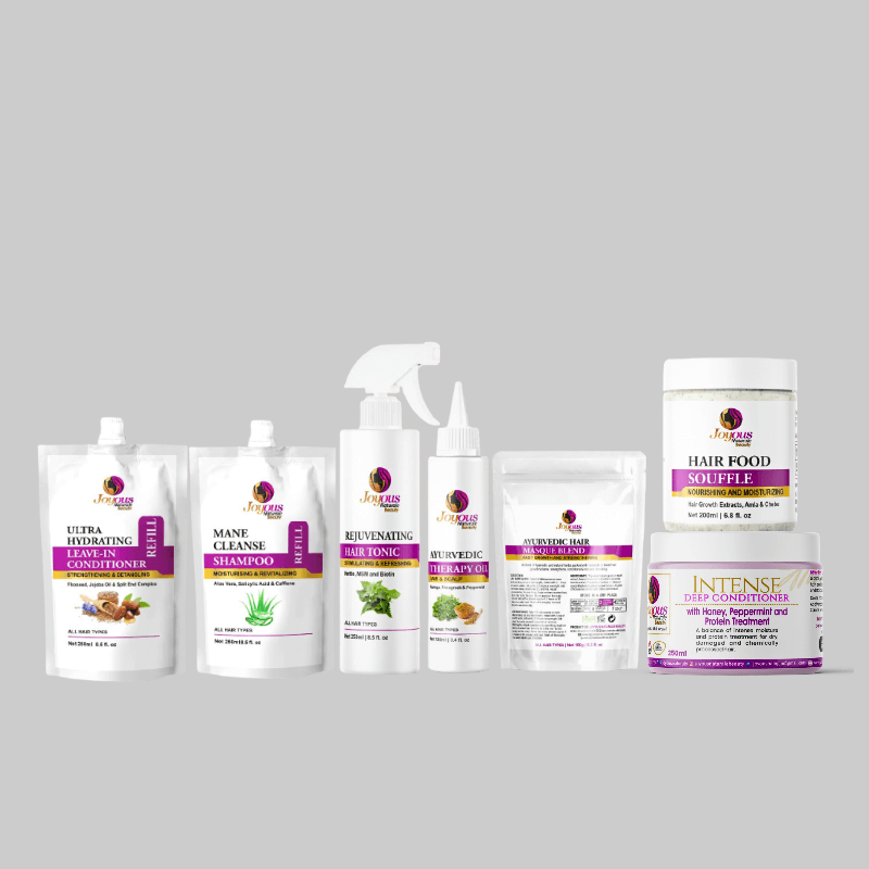 Complete Hair Care Set(Economy Size) consists of: Rejuvenating Hair Tonic (250ml) Hair Food Souffle (200ml) Ayurvedic Therapy Oil (100ml) Ultra Hydrating Leave-in Conditioner(250ml) Mane Cleanse Shampoo(250ml) Intense Deep Conditioner (250ml) Ayurvedic Hair Masque Blend (150g)